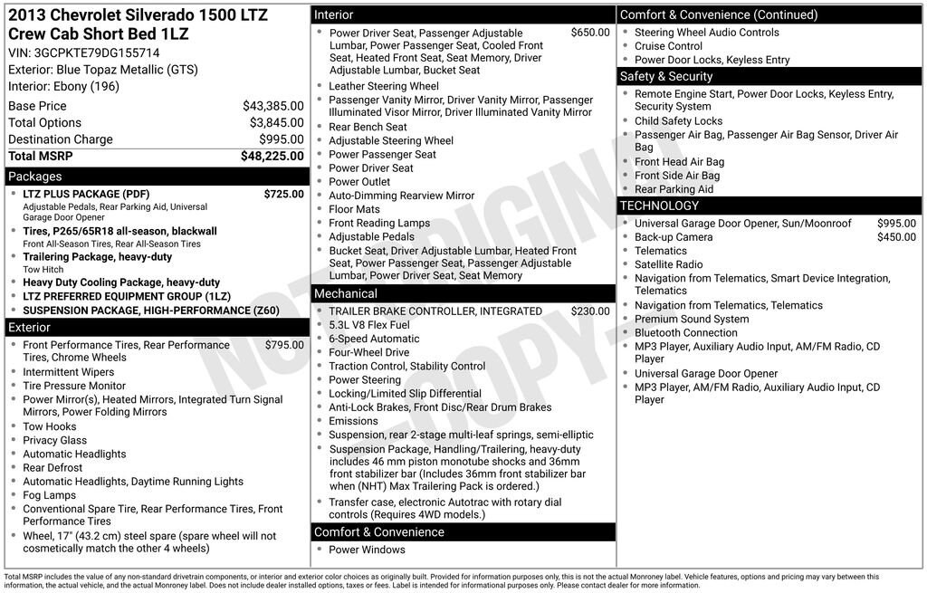 *Please inquire for a personalized Video Walk-Around of this vehicle! Nationwide shipping available!*This 2013 Chevrolet Silverado 1500 LTZ is a powerful and well-equipped truck that's ready to take on any task. Boasting a Vortec 5.3L V8 engine and 4-wheel drive, this Silverado delivers impressive performance and capability.- SUNROOF, POWER- TRAILER BRAKE CONTROLLER, INTEGRATED- SEATS, HEATED AND COOLED DRIVER AND FRONT PASSENGER FRONT BUCKET- LTZ PLUS PACKAGE- WHEELS, 4 - 20 X 8.5 (50.8 CM X 21.6 CM) CHROME-CLAD ALUMINUM- REAR VISION CAMERAThe interior of this Silverado is equally impressive, with features like dual-zone automatic climate control, Bluetooth connectivity, and a premium Bose audio system. The heated and cooled front seats provide ultimate comfort, while the power-adjustable pedals and driver's memory seat ensure a personalized driving experience.For those who tow or haul heavy loads, this Silverado is equipped with a heavy-duty trailering package, including an integrated trailer brake controller and a high-performance suspension. The EZ-Lift tailgate and rear parking assist make loading and unloading a breeze.Beyond the impressive features, this Silverado also boasts a sleek and stylish exterior. The bold blue paint and chrome accents give it a commanding presence on the road, while the body-colored bumpers and grille add a touch of refinement.Whether you're looking for a capable work truck or a comfortable daily driver, this 2013 Chevrolet Silverado 1500 LTZ is an exceptional choice. With its powerful engine, advanced technology, and premium amenities, it's sure to exceed your expectations.Chevrolet GMC of Mount Vernon provides peace of mind with our Complimentary LIFETIME ENGINE/MOTOR WARRANTY included on a qualifying New or Pre-Owned vehicle purchase! Inquire for eligibility.We serve Mount Vernon, Newark, Mansfield, Galion, Pataskala, Westerville, Delaware, Ashland and surrounding Central Ohio communities!We carry all makes and models. We have other vehicles with Apple CarPlay, Android Auto, Heads Up Display, Lane Departure System, Blind Spot Monitor, Heated Steering Wheel, Remote Start, Navigation, Rear Entertainment System, 3rd Row Seats, Backup Camera, Panoramic Sunroof, Bluetooth, Hands-Free, Adaptive Cruise Control, Leather Seats, Keyless Entry, Heated Seats, Tow Hitch, 4-Wheel Drive and All-wheel Drive, Active Park Assist, 360 degree Surround View Camera, Power Liftgate, Third Row Seating, Keyless Entry. Although every reasonable effort has been made to ensure the accuracy of the information contained on this site, absolute accuracy cannot be guaranteed.