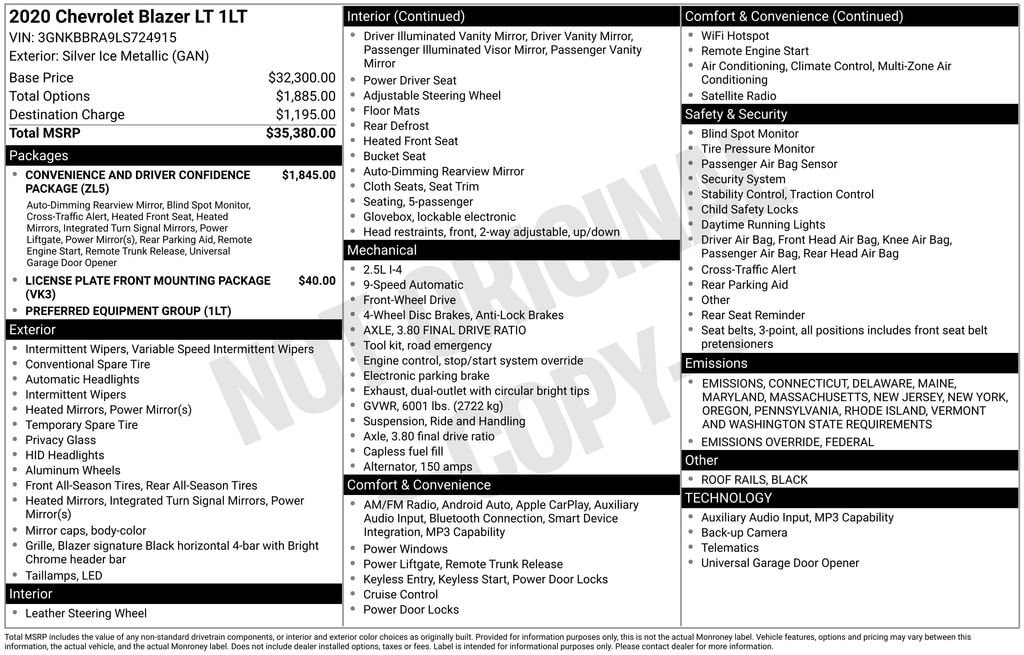 Priced below KBB Fair Purchase Price!*Please inquire for a personalized Video Walk-Around of this vehicle! Nationwide shipping available!*Silver Ice Metallic 2020 Chevrolet Blazer LTFWD 2.5L 4-Cylinder21/27 City/Highway MPGAwards:* JD Power Automotive Performance, Execution and Layout (APEAL) Study*Please inquire for a personalized Video Walk-Around of this vehicle! Nationwide shipping available!* **We carry All Makes and Models** We have other vehicles with Apple CarPlay, Android Auto, Heads Up Display, Lane Departure System, Blind Spot Monitor, Heated Steering Wheel, Remote Start, Navigation, Rear Entertainment System, DVD Player, 3rd Row Seats, Backup Camera, Panoramic Sunroof, Bluetooth, Hands-Free, Adaptive Cruise Control, Leather Seats, Keyless Entry, Heated Seats, Tow Hitch, Tow Hooks, 4-Wheel Drive and All-wheel Drive, Active Park Assist, 360 degree Surround View Camera, Brake Assist, Power Liftgate, Third Row Seating, Keyless Entry. Although every reasonable effort has been made to ensure the accuracy of the information contained on this site, absolute accuracy cannot be guaranteed. This site, and all information and materials appearing on it, are presented to the user as is without warranty of any kind, either express or implied. All vehicles are subject to prior sale. Price does not include applicable tax, title, license, and/or $387 documentary service fee.Excellent Service History, Android Auto/Apple CarPlay, Backup Camera, Bluetooth, Heated Seats, Keyless Entry, Power Liftgate, Push Button Start, Remote Start, 3.80 Final Drive Axle Ratio, 4-Wheel Disc Brakes, 6 Speakers, 6-Speaker Audio System Feature, ABS brakes, Air Conditioning, Alloy wheels, AM/FM radio: SiriusXM, Apple CarPlay/Android Auto, Automatic temperature control, Black Roof Rails, Brake assist, Bumpers: body-color, Child-Seat-Sensing Airbag, Compass, Convenience & Driver Confidence Package, Delay-off headlights, Driver door bin, Driver vanity mirror, Dual front impact airbags, Dual front side impact airbags, Electronic Stability Control, Emergency communication system: OnStar and Chevrolet connected services capable, Exterior Parking Camera Rear, Four wheel independent suspension, Front anti-roll bar, Front Bucket Seats, Front Center Armrest, Front dual zone A/C, Front reading lights, Fully automatic headlights, Heated door mirrors, Heated Driver & Front Passenger Seats, High-Intensity Discharge Headlights, Illuminated entry, Inside Rear-View Auto-Dimming Mirror, Knee airbag, Lane Change Alert w/Side Blind Zone Alert, Leather Shift Knob, Low tire pressure warning, Occupant sensing airbag, Outside Heated Power-Adjustable Body-Color Mirrors, Outside temperature display, Overhead airbag, Overhead console, Panic alarm, Passenger door bin, Passenger vanity mirror, Power door mirrors, Power driver seat, Power steering, Power windows, Preferred Equipment Group 1LT, Premium Cloth Seat Trim, Radio data system, Radio: Chevrolet Infotainment 3 System, Rear anti-roll bar, Rear Cross Traffic Alert, Rear Park Assist w/Audible Warning, Rear Power Programmable Liftgate, Rear reading lights, Rear seat center armrest, Rear window defroster, Rear window wiper, Remote keyless entry, Remote Start, Ride & Handling Suspension, Security system, SiriusXM Radio, Speed control, Speed-sensing steering, Split folding rear seat, Spoiler, Steering wheel mounted audio controls, Tachometer, Telescoping steering wheel, Tilt steering wheel, Traction control, Trip computer, Universal Home Remote, Variably intermittent wipers, Voltmeter, Wheels: 18 Bright Silver Aluminum.