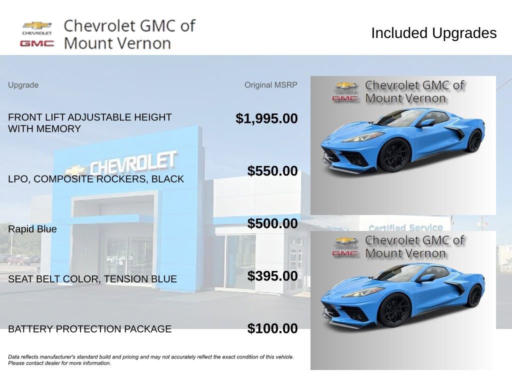 *Please inquire for a personalized Video Walk-Around of this vehicle! Nationwide shipping available!*This 2021 Chevrolet Corvette Stingray 3LT is a true performance masterpiece. Equipped with a powerful 6.2L V8 engine and an 8-Speed Dual Clutch transmission, this Corvette delivers an exhilarating driving experience with exceptional power and responsiveness. Finished in a stunning Blue exterior, this Corvette also boasts a wealth of premium features, including:- Front Lift Adjustable Height with Memory- Black Composite Rockers (LPO)- Tension Blue Seat Belt Color- Battery Protection PackageThe interior of this Corvette Stingray 3LT is equally impressive, featuring a Custom Leather Wrapped Interior Package, Memory Driver & Passenger Convenience Package, and a Bose Performance Series Sound System with 14 speakers. The Heads-Up Display and Navigation System further enhance the driving experience, while the Heated and Ventilated Seats provide exceptional comfort.Designed to deliver thrilling performance and uncompromising luxury, this 2021 Chevrolet Corvette Stingray 3LT is a true automotive masterpiece. With its stunning appearance, cutting-edge technology, and exceptional driving dynamics, this Corvette is sure to turn heads and leave a lasting impression.At Chevrolet GMC of Mount Vernon, we take pride in offering our customers the finest pre-owned vehicles on the market. Our team of experienced professionals is dedicated to providing a seamless and enjoyable purchasing experience, ensuring that you drive away in the car of your dreams.Don't miss your chance to experience the power and elegance of this 2021 Chevrolet Corvette Stingray 3LT. Contact us today to schedule a test drive and discover the true meaning of automotive excellence.Chevrolet GMC of Mount Vernon provides peace of mind with our Complimentary LIFETIME ENGINE/MOTOR WARRANTY included on a qualifying New or Pre-Owned vehicle purchase! Inquire for eligibility.We serve Mount Vernon, Newark, Mansfield, Galion, Pataskala, Westerville, Delaware, Ashland and surrounding Central Ohio communities!We carry all makes and models. We have other vehicles with Apple CarPlay, Android Auto, Heads Up Display, Lane Departure System, Blind Spot Monitor, Heated Steering Wheel, Remote Start, Navigation, Rear Entertainment System, 3rd Row Seats, Backup Camera, Panoramic Sunroof, Bluetooth, Hands-Free, Adaptive Cruise Control, Leather Seats, Keyless Entry, Heated Seats, Tow Hitch, 4-Wheel Drive and All-wheel Drive, Active Park Assist, 360 degree Surround View Camera, Power Liftgate, Third Row Seating, Keyless Entry. Although every reasonable effort has been made to ensure the accuracy of the information contained on this site, absolute accuracy cannot be guaranteed.