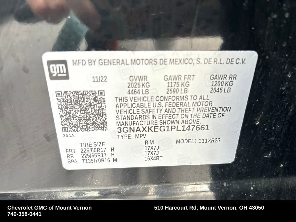 *Please inquire for a personalized Video Walk-Around of this vehicle! Nationwide shipping available!*This 2023 Chevrolet Equinox LT is a standout in the compact SUV segment, offering a winning combination of style, functionality, and performance. With its sleek black exterior, this Equinox exudes a sophisticated and modern aesthetic that is sure to turn heads wherever you go.- Wireless Apple CarPlay/Wireless Android Auto- 2-Way Power Driver Lumbar Control Seat Adjuster- Driver 8-Way Power Seat Adjuster- 17 Aluminum WheelsUnder the hood, the 1.5L DOHC engine and 6-Speed Automatic Transmission with Overdrive deliver a smooth and efficient driving experience, with an impressive 26 MPG in the city and 31 MPG on the highway. Whether you're navigating the daily commute or embarking on a weekend adventure, this Equinox is up for the task.The spacious interior of the Equinox LT provides ample room for passengers and cargo, with a split-folding rear seat that offers versatility to accommodate your needs. The premium cloth upholstery and thoughtful design elements create a comfortable and inviting environment, while the Chevrolet Infotainment 3 system with SiriusXM Radio keeps you connected and entertained on the go.Safety is also a top priority, with features like Dual Front Impact Airbags, Dual Front Side Impact Airbags, Overhead Airbag, and Electronic Stability Control providing peace of mind behind the wheel. The Rear Window Wiper and Variably Intermittent Wipers ensure clear visibility in all weather conditions.This 2023 Chevrolet Equinox LT is a versatile and well-equipped SUV that is sure to impress. With its impressive features, efficient performance, and sleek design, it's the perfect choice for those seeking a practical and stylish vehicle to enhance their daily driving experience.Chevrolet GMC of Mount Vernon provides peace of mind with our Complimentary LIFETIME ENGINE/MOTOR WARRANTY included on a qualifying New or Pre-Owned vehicle purchase! Inquire for eligibility.We serve Mount Vernon, Newark, Mansfield, Galion, Pataskala, Westerville, Delaware, Ashland and surrounding Central Ohio communities!We carry all makes and models. We have other vehicles with Apple CarPlay, Android Auto, Heads Up Display, Lane Departure System, Blind Spot Monitor, Heated Steering Wheel, Remote Start, Navigation, Rear Entertainment System, 3rd Row Seats, Backup Camera, Panoramic Sunroof, Bluetooth, Hands-Free, Adaptive Cruise Control, Leather Seats, Keyless Entry, Heated Seats, Tow Hitch, 4-Wheel Drive and All-wheel Drive, Active Park Assist, 360 degree Surround View Camera, Power Liftgate, Third Row Seating, Keyless Entry. Although every reasonable effort has been made to ensure the accuracy of the information contained on this site, absolute accuracy cannot be guaranteed.