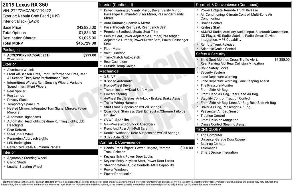 This vehicle is the perfect blend of luxury, performance, and safety. Whether you're commuting, running errands, or embarking on a road trip, the 2019 Lexus RX 350 is ready to elevate your driving experience.