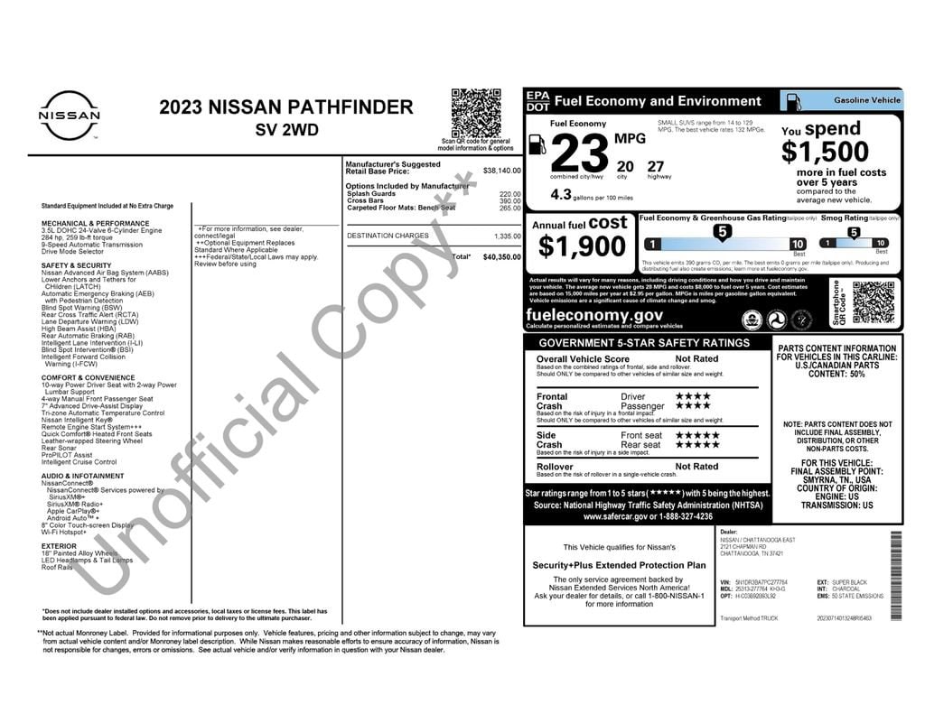 Under the hood, the Pathfinder SV is powered by a robust V6 engine paired with a smooth-shifting 9-speed automatic transmission, delivering an exceptional blend of performance and efficiency. With 20 city/27 highway MPG, you'll enjoy the freedom to explore without constantly stopping at the pump.