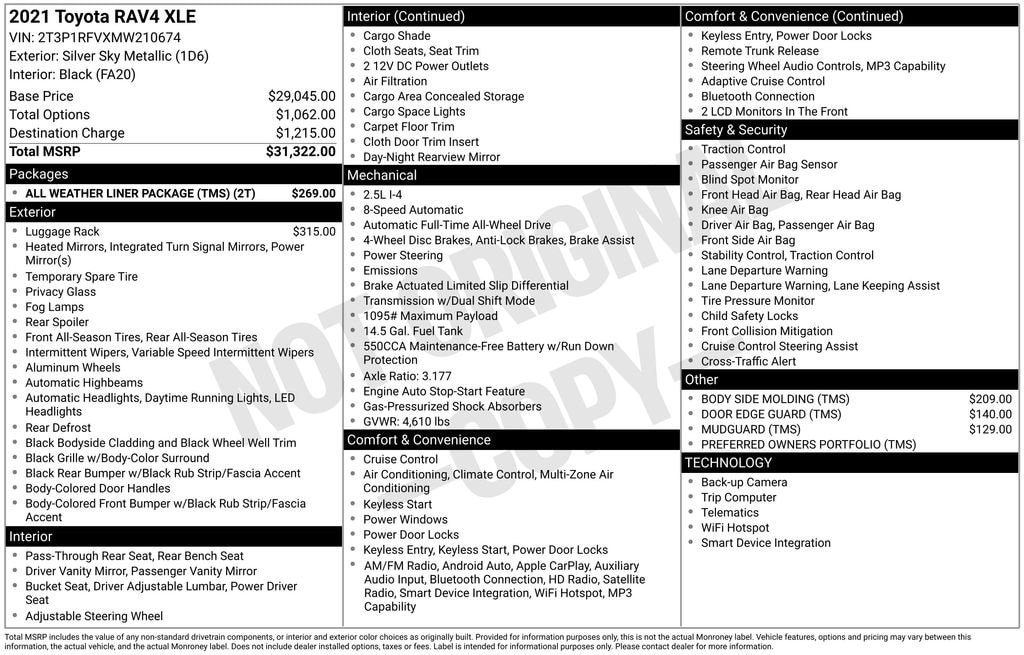 AWD, Black Cloth, 4-Wheel Disc Brakes, 6 Speakers, ABS brakes, Air Conditioning, All Weather Floor Liners, All Weather Liner Package (TMS), Alloy wheels, AM/FM radio: SiriusXM, AM/FM Stereo, Apple CarPlay/Android Auto, Auto High-beam Headlights, Automatic temperature control, Axle Ratio: 3.177, Body Side Molding (TMS), Brake assist, Bumpers: body-color, Cargo Liner (TMS), Delay-off headlights, Door Edge Guard (TMS), Driver door bin, Driver vanity mirror, Dual front impact airbags, Dual front side impact airbags, Electronic Stability Control, Emergency communication system, Exterior Parking Camera Rear, Fabric Seat Trim, Four wheel independent suspension, Front anti-roll bar, Front Bucket Seats, Front Center Armrest, Front dual zone A/C, Front fog lights, Front reading lights, Fully automatic headlights, Heated door mirrors, Illuminated entry, Knee airbag, Low tire pressure warning, Mudguard (TMS), Occupant sensing airbag, Outside temperature display, Overhead airbag, Overhead console, Panic alarm, Passenger door bin, Passenger vanity mirror, Power door mirrors, Power driver seat, Power steering, Power windows, Preferred Owners Portfolio (TMS), Radio data system, Rear anti-roll bar, Rear seat center armrest, Rear window defroster, Rear window wiper, Remote keyless entry, Roof Rack Cross Bars (TMS), Roof rack: rails only, Speed control, Speed-sensing steering, Split folding rear seat, Spoiler, Steering wheel mounted audio controls, Tachometer, Telescoping steering wheel, Tilt steering wheel, Traction control, Trip computer, Turn signal indicator mirrors, Variably intermittent wipers, Wheels: 17 5-Spoke Silver Alloy, AWD, Black Cloth.