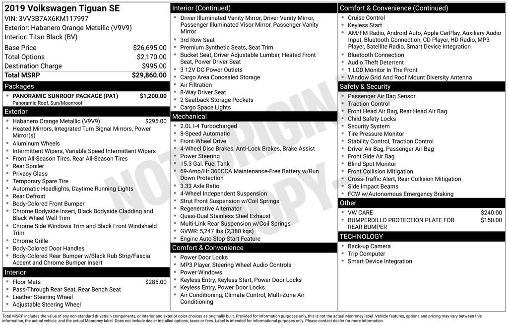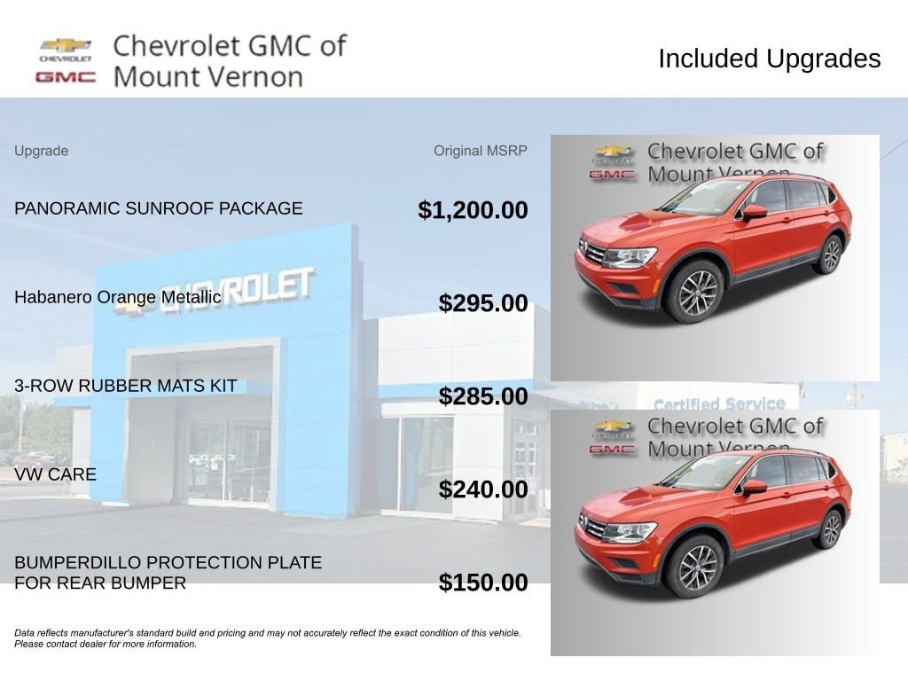 *Please inquire for a personalized Video Walk-Around of this vehicle! Nationwide shipping available!*This 2019 Volkswagen Tiguan 2.0T SE is a standout in its class, offering a winning combination of style, performance, and versatility. With its sleek orange exterior, panoramic sunroof, and premium features, this Tiguan is sure to turn heads and provide an exceptional driving experience.- Panoramic Sunroof Package- Habanero Orange Metallic- 3-Row Rubber Mats Kit- VW CareThe Tiguan's 2.0L TSI DOHC engine, paired with an 8-Speed Automatic with Tiptronic transmission, delivers a smooth and responsive ride, with an impressive fuel efficiency of 22 MPG in the city and 29 MPG on the highway. The front-wheel-drive configuration ensures confident handling, while the 4-Wheel Independent Suspension and 4-Wheel Disc Brakes provide a comfortable and secure driving experience.Inside, the Tiguan's spacious cabin is outfitted with premium features, including a Panoramic Sunroof, Heated Front Comfort Seats, and a Composition Media AM/FM/HD Radio with Remote CD Player. The Perforated V-Tex Leatherette Seating Surfaces and Leather Shift Knob add a touch of sophistication, while the 3-Row Rubber Mats Kit and Heavy Duty Trunk Liner with VW CarGo Blocks provide practical protection.Safety is also a top priority, with features like Forward Collision Warning with Autonomous Emergency Braking, Dual Front Impact Airbags, Dual Front Side Impact Airbags, and Electronic Stability Control. The Exterior Parking Camera Rear and Bumperdillo Protection Plate for the Rear Bumper further enhance the Tiguan's functionality and protection.This 2019 Volkswagen Tiguan 2.0T SE is a remarkable vehicle that combines style, performance, and practicality. With its impressive features and well-rounded capabilities, it's the perfect choice for those seeking a versatile and sophisticated SUV. Don't miss the opportunity to experience the Tiguan's exceptional qualities firsthand.Chevrolet GMC of Mount Vernon provides peace of mind with our Complimentary LIFETIME ENGINE/MOTOR WARRANTY included on a qualifying New or Pre-Owned vehicle purchase! Inquire for eligibility.We serve Mount Vernon, Newark, Mansfield, Galion, Pataskala, Westerville, Delaware, Ashland and surrounding Central Ohio communities!We carry all makes and models. We have other vehicles with Apple CarPlay, Android Auto, Heads Up Display, Lane Departure System, Blind Spot Monitor, Heated Steering Wheel, Remote Start, Navigation, Rear Entertainment System, 3rd Row Seats, Backup Camera, Panoramic Sunroof, Bluetooth, Hands-Free, Adaptive Cruise Control, Leather Seats, Keyless Entry, Heated Seats, Tow Hitch, 4-Wheel Drive and All-wheel Drive, Active Park Assist, 360 degree Surround View Camera, Power Liftgate, Third Row Seating, Keyless Entry. Although every reasonable effort has been made to ensure the accuracy of the information contained on this site, absolute accuracy cannot be guaranteed.